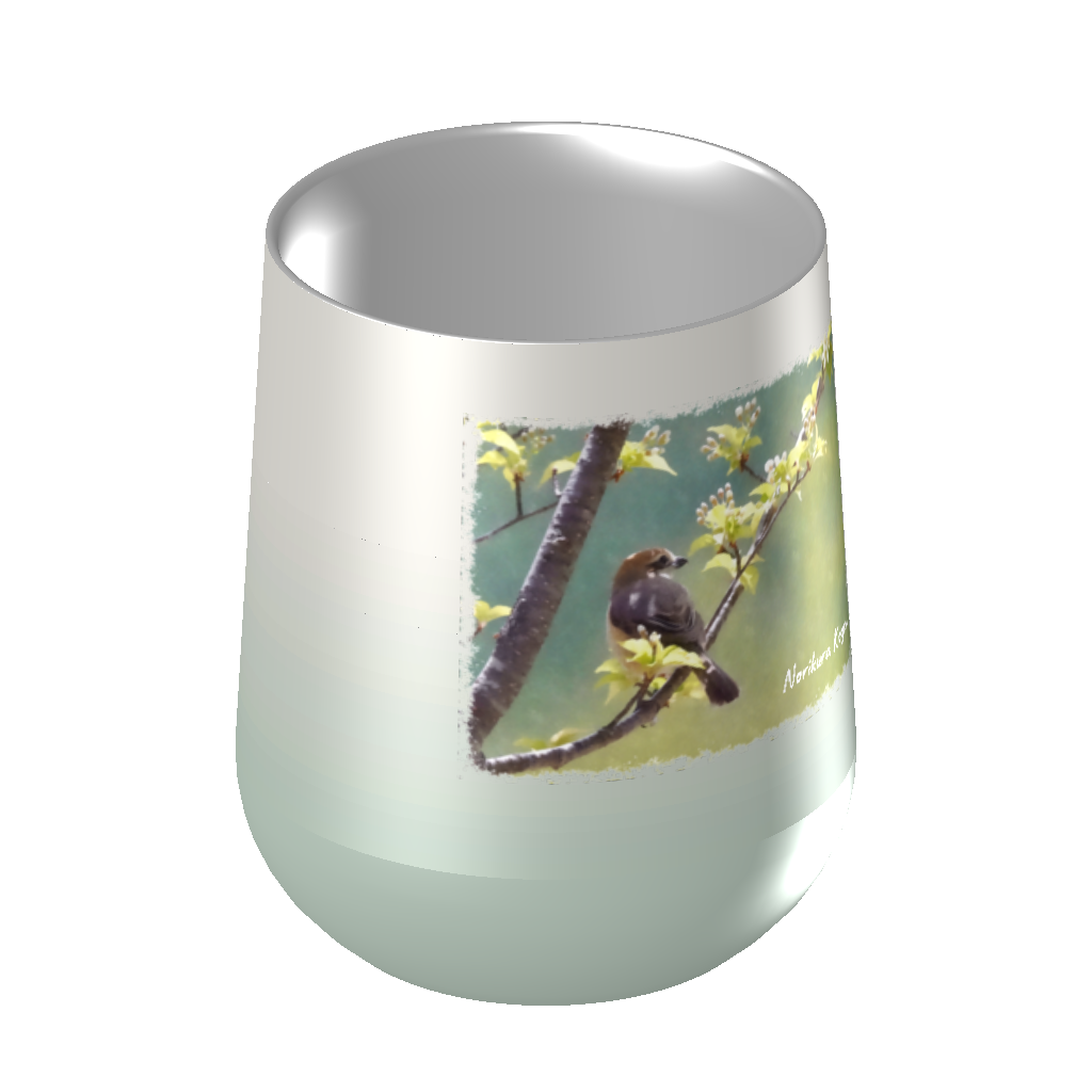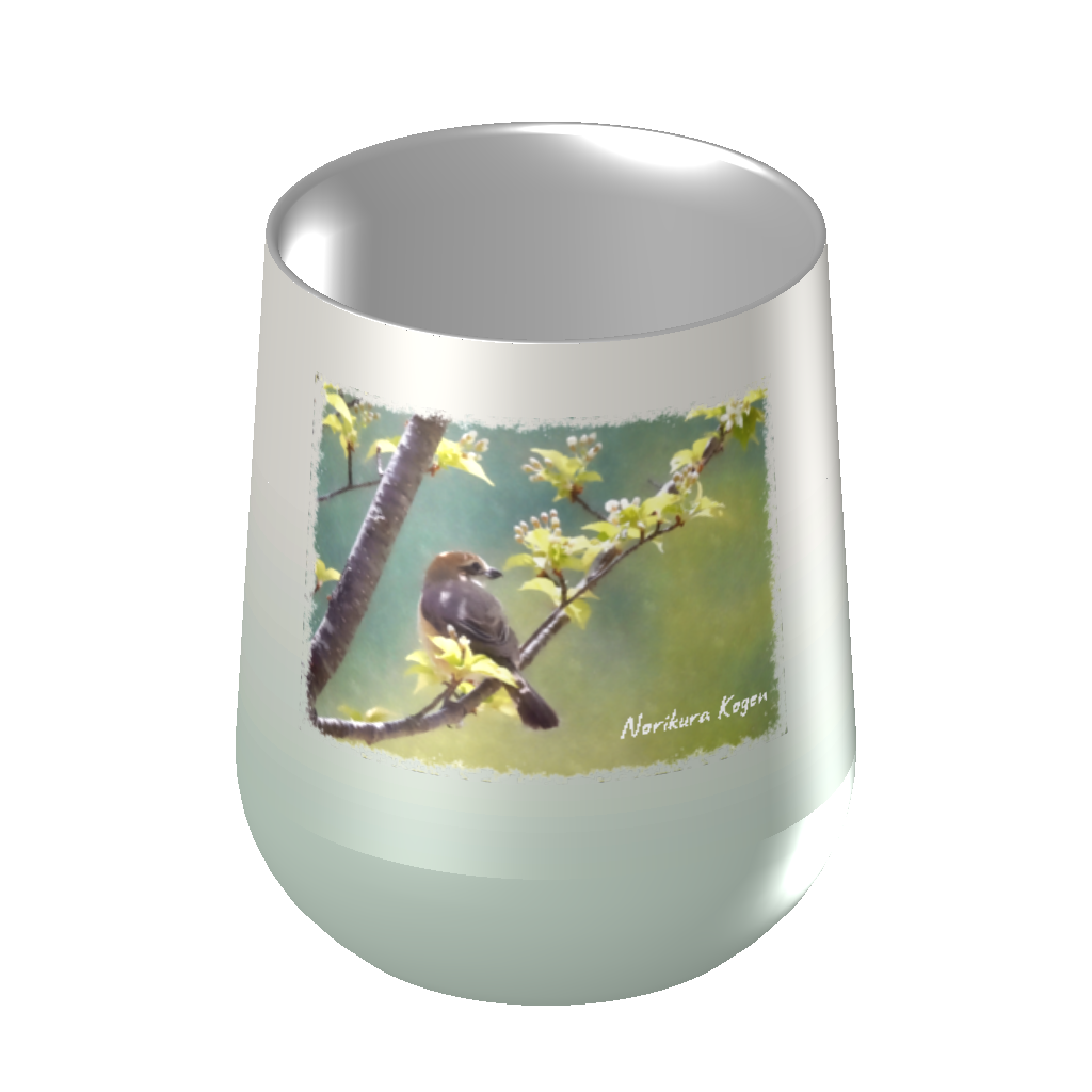 ころんとしたラウンドシルエットが淡いグラデーションカラーを引き立てる 「グラデーションサーモラウンドタンブラー」に、モズをデザインしました。