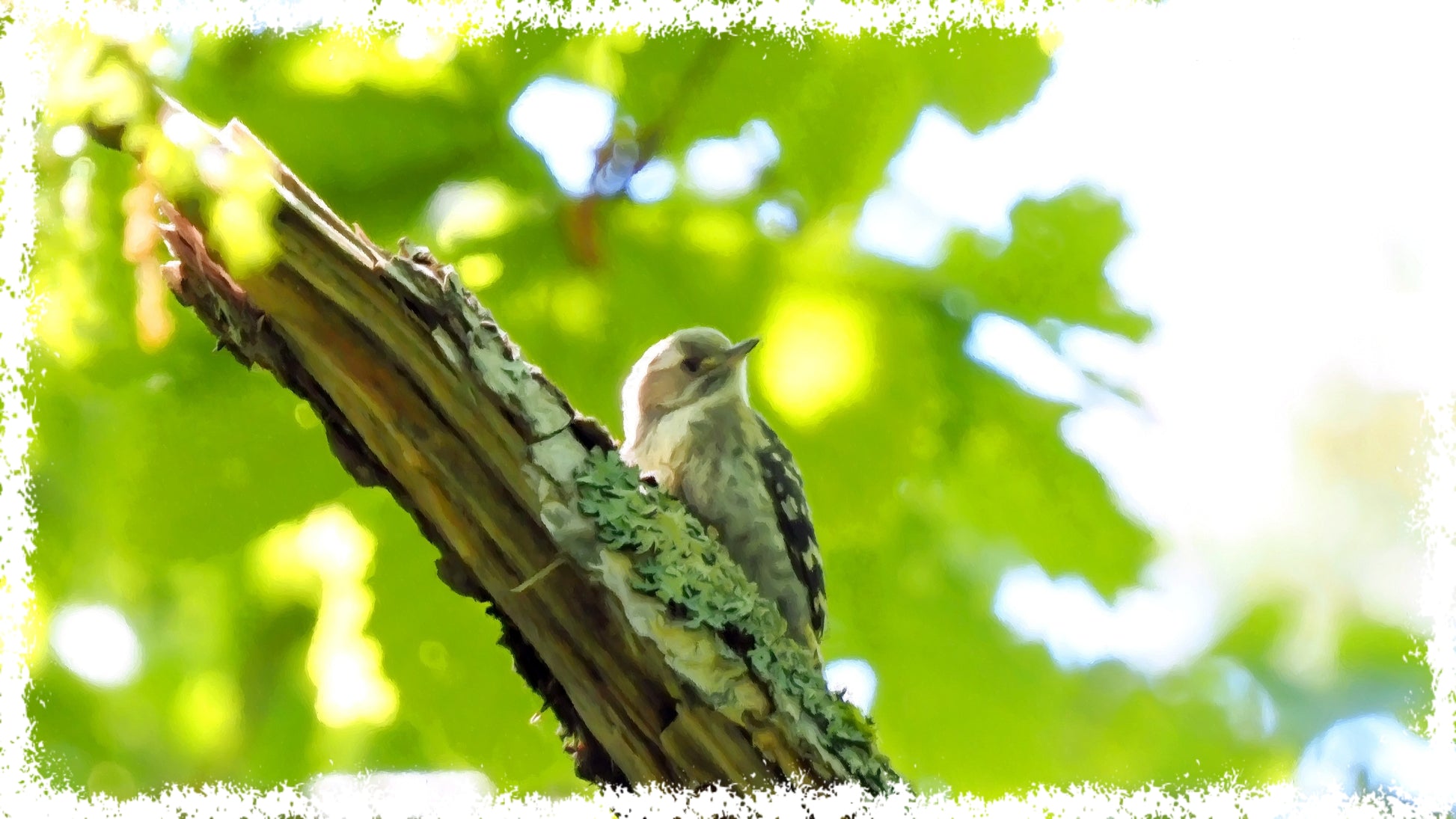 GLIMMERドライTシャツに、巣立ったばかりの愛らしいコゲラの幼鳥をあしらいました!